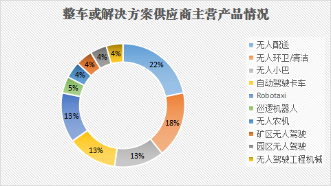 具体分析,19家整车或解决方案供应商融资19起,其中5家企业主营产品涉及无人配送,包括毫末智行、易咖智车、诺亚医院物流机器人、汉特云、橡鹭科技,占比最高。其次是无人环卫/清洁,酷哇机器人、环宇智行、诺亚物流机器人、汉特云这4家企业都有相关产品。此外,无人小巴、自动驾驶卡车、Robotaxi三个赛道热度相当,各有3家企业。