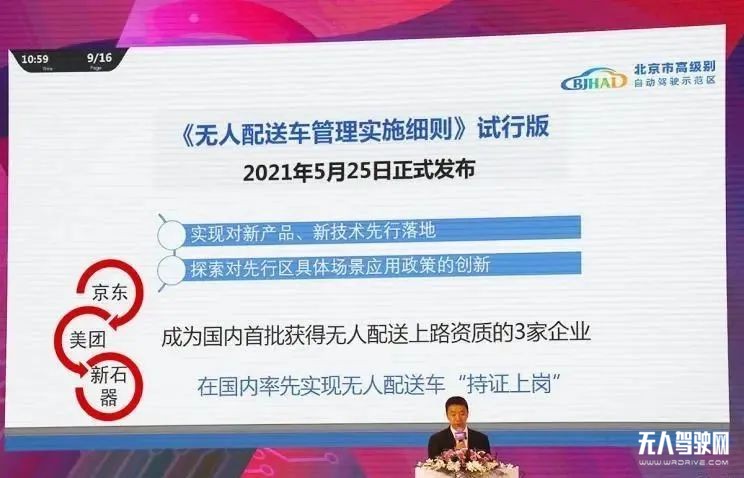 2021年5月,由北京市经济技术开发区正式发布,是全国首个无人配送车运营管理实施细则,突破了无人配送车受现行法律法规限制无法合规上路,拓展了无人配送车测试验证空间,将推动无人配送车技术创新,从场景应用加快走向商业化。