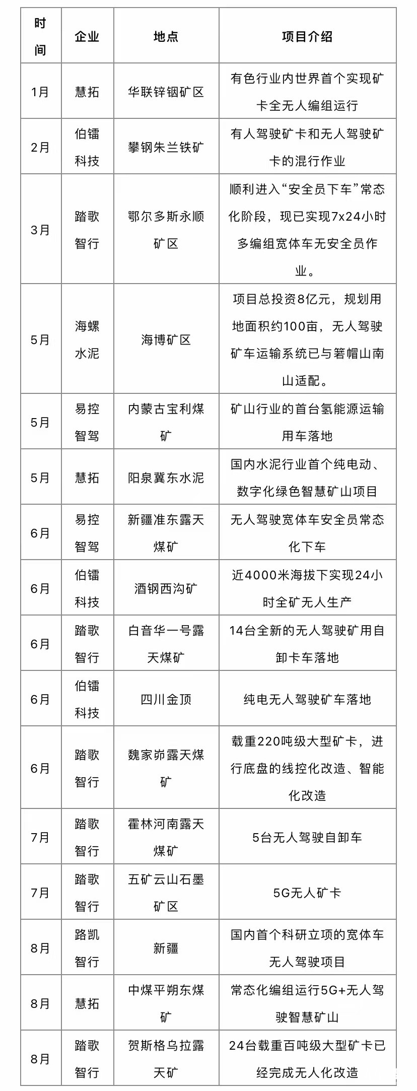 基于技术和产品的快速发展,矿区无人驾驶领域各企业今年以来实现了多个全球、全国“首次”及行业标杆项目,大力推进了国内矿区无人驾驶领域发展,具体包括: