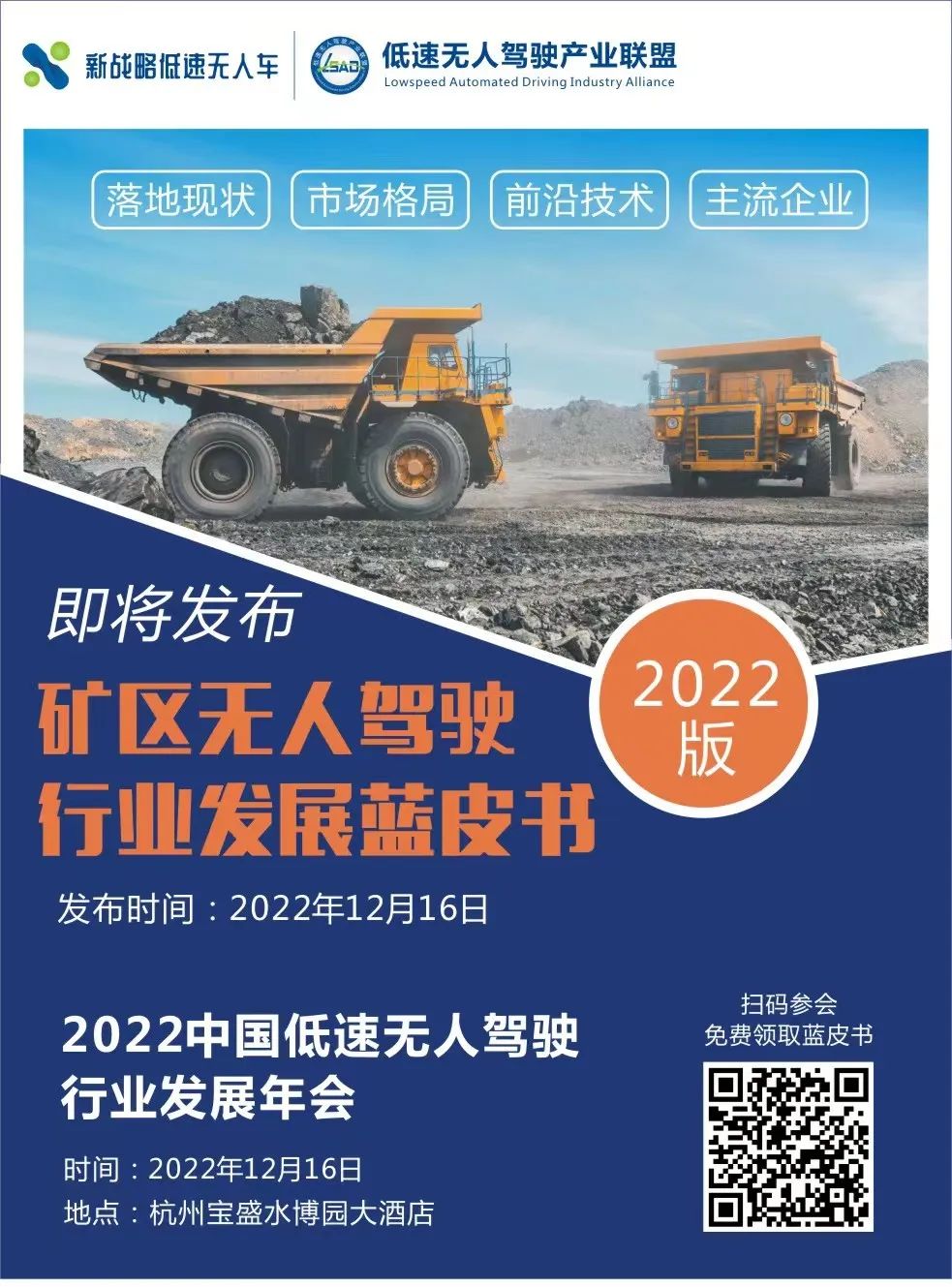 为了解析当前低速无人驾驶在矿区场景的解决方案和市场应用现状,12月16日,由低速无人驾驶产业联盟主编,青岛慧拓智能机器有限公司、北京易控智驾科技有限公司、上海伯镭智能科技有限公司、北京路凯智行科技有限公司、北京踏歌智行科技有限公司、名商科技有限公司联合参编的《矿区无人驾驶行业发展蓝皮书(2022版)》将在“2022中国低速无人驾驶行业发展年会”上正式发布,参会人员可免费获得蓝皮书纸质版一份,敬请期待!