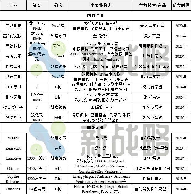 从融资领域看,整车企业中服务机器人、割草机器人研发商更多。供应链企业则属视觉传感器、激光雷达、毫米波雷达等自动驾驶感知系统研发商为多,共5家,其中4家为国内企业。国内传感器研发商正在加速崛起,特别是北科天绘获得1.8亿元B轮融资,福瑞泰克获得数亿元B+轮融资,进一步促进了企业面向智能驾驶、自动驾驶的技术产品迭代,为无人驾驶车辆的商用落地提供可靠支持。