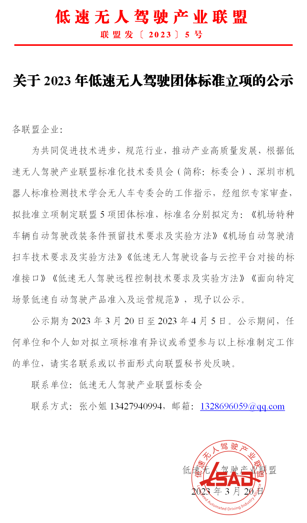低速无人驾驶产业联盟关于2023年团体标准立项的公示
