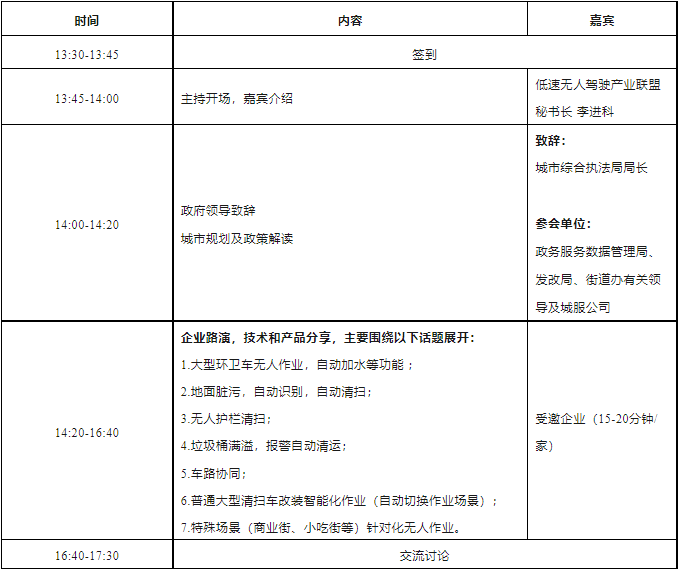 规模及参会对象:20人,参会人员包括该城市政府代表、街道办/城服公司/低速无人驾驶清洁环卫整车/解决方案供应商