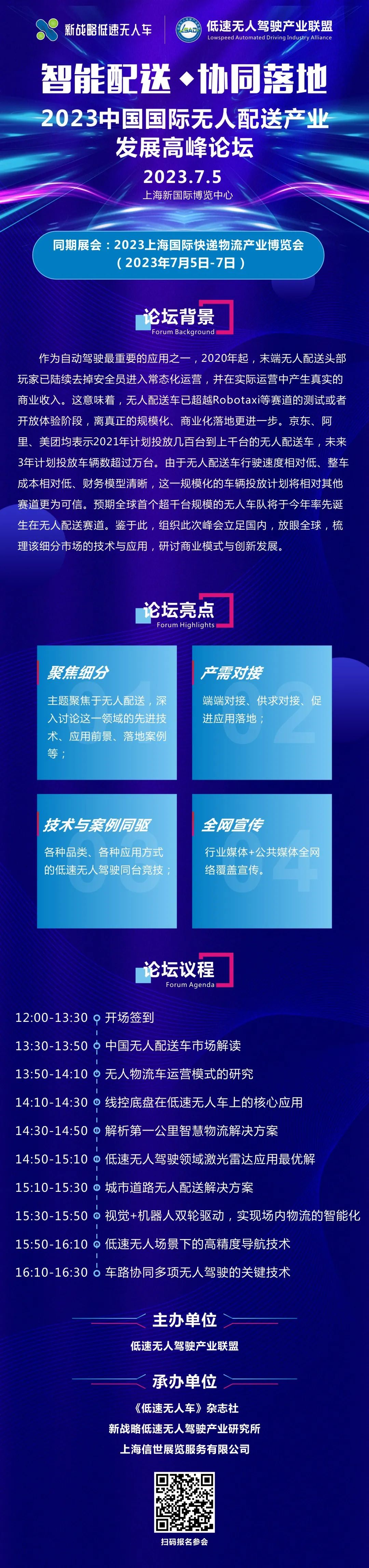 2023年,面对新一轮落地应用之争,中国无人配送市场现状如何?需要抓住的未来发展机遇有哪些?为此,低速无人驾驶产业联盟将举办“2023中国国际无人配送产业发展高峰论坛”,立足国内,放眼全球,研讨无人配送商业模式与创新发展。