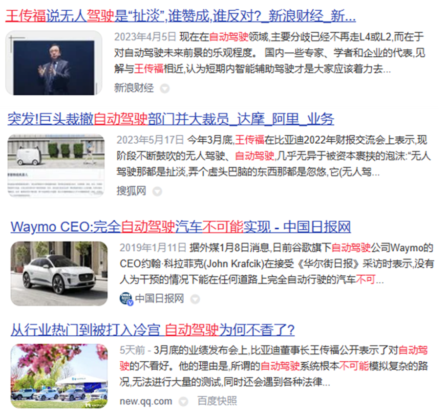 比亚迪董事长王传福曾表示,“无人驾驶都是扯淡,弄个虚头巴脑的东西,那都是忽悠,它就是一场皇帝的新装。”该言论在行业内引发了较大的争议。