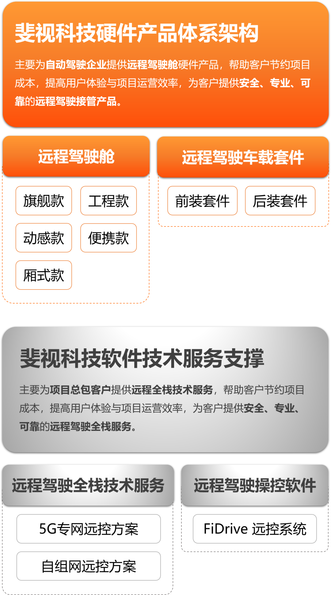 长沙斐视科技有限公司(以下简称“斐视科技”)是行业领先的远程驾驶系统解决方案供应商。公司致力于为自动驾驶系统提供远程接管安全底线保障、实现自动驾驶车辆“方向盘后无人”,即“车内纯无人驾驶”的目标。