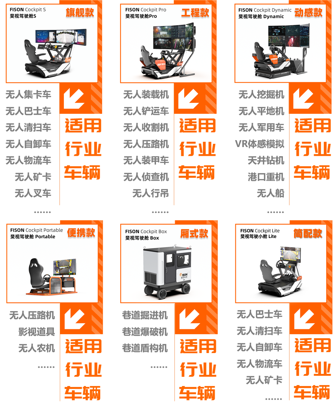 作为自动驾驶系统的“第二现场”,远程驾驶舱能够完成远端自动驾驶车辆的监控与接管工作任务,是面向业主客户的核心前端智能硬件设备。斐视科技在此领域拥有多年的研发基础——产品多达十余项创新点,为客户带来最专业的远控驾驶体验,完善的远程驾驶舱产品体系,可以匹配各类行业的远控需求。用户可以根据自己的需求,选择适配的远程驾驶舱款型,不论是任何行业、任何工种的车辆,斐视驾驶舱都可轻松驾驭。