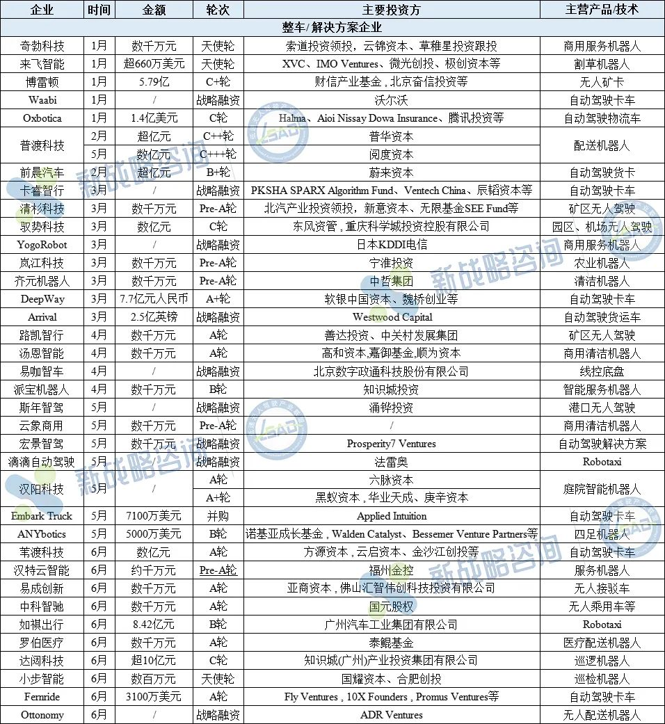 而无人物流/配送车企业有8家,融资金额超35亿元。其中,英国的Oxbotica作为全球无人配送的领先布局企业,最新一轮融资收获了1.4亿美元(约合人民币近10亿元)。普渡科技则作为送餐机器人代表企业之一,连续2轮获得超亿元融资。