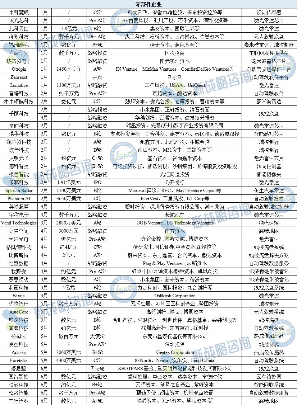 国内外零部件企业共47家获得融资,激光雷达、线控底盘、毫米波雷达三大核心技术上半年投资热度靠前。其中,禾赛科技、天眸光电、阜时科技等9家激光雷达企业融资超18亿元。