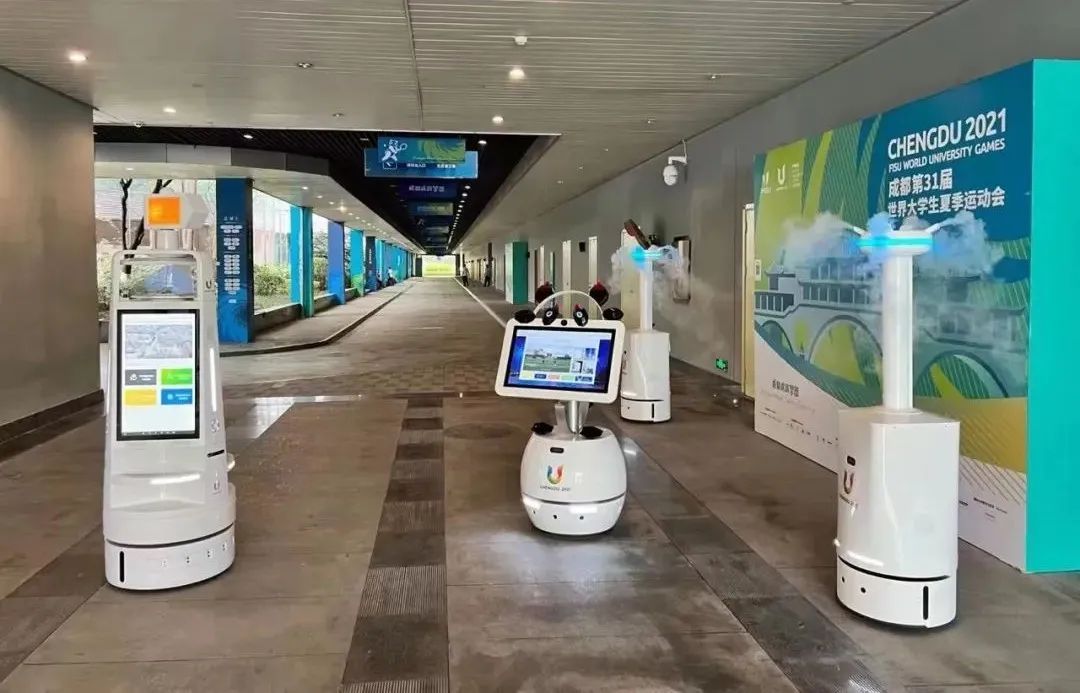 在成都大运会主场馆,还有多款智能防疫消杀机器人,可以代替传统人工消杀,实现非接触式操作,降低环境中交叉感染风险,人员无需进入消毒区域,让场馆消杀工作更高效、更安全、更智能。