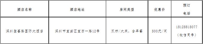 因会议期间(会议酒店:深圳登喜路国际大酒店)酒店房间紧张,请各参会嘉宾尽早进行酒店预订。
