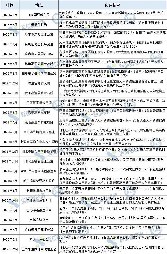 近五年国内部分无人驾驶工程机械落地应用项目(据公开报道,新战略低速无人驾驶产业研究所不完全统计,未完善之处请指正)