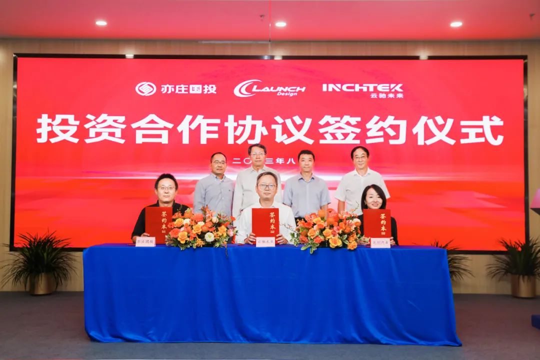 北京亦庄国际投资发展有限公司汽车部部长刘伯年、上海龙创汽车设计股份有限公司CFO杨虹、云驰未来总裁郑强签署投资合作协议