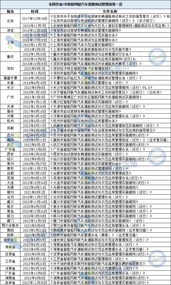 国内主要城市智能网联汽车道路测试管理政策汇总表(据公开信息,新战略低速无人驾驶产业研究所不完全统计,未完善之处请指正!)