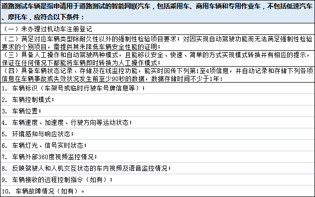 同时,要求车辆必须具备人工操作和自动驾驶两种模式;具备车辆状态记录、存储及在线监控功能。