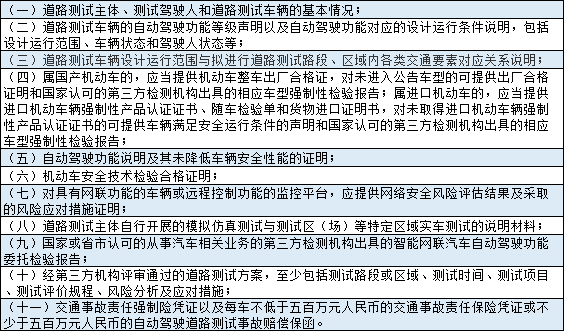 1、道路测试主体应提供道路测试安全性自我声明及自动驾驶功能等级声明、设计运行条件、网络安全措施等12项材料由相关主管部门进行确认。