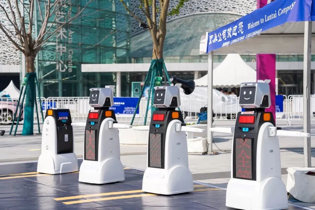 大会现场演示的交通隔离机器人,具备人脸识别、危险事件预警、语音互动、自主行走、手臂指挥、长时录像等功能。产品主要用于车道隔离、事故隔离及施工现场应急处理,也可拓展应用于校园巡逻、校门口交通安全疏导等。