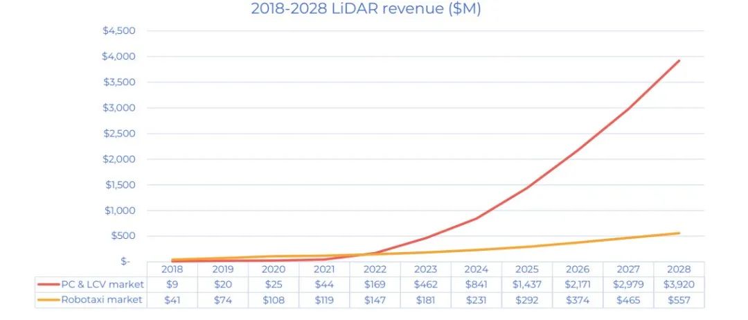 Yole报告指出,全球车端激光雷达的需求仍在迅速增长,市场预计将从2022年的3亿美元左右增长到2028年的45亿美元左右。