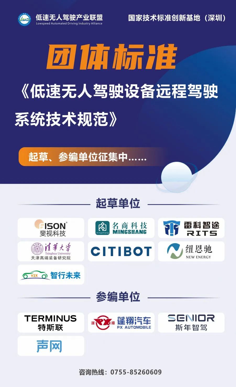 联盟此次组织制定的团体标准由长沙斐视科技有限公司、名商科技有限公司、理工雷科智途(北京)科技有限公司、湖南纽恩驰新能源车辆有限公司、清华大学天津高端装备研究院、福龙马城服机器人科技有限公司、南通智行未来车联网创新中心有限公司起草,特斯联科技集团、 山东蓬翔汽车有限公司、北京斯年智驾科技有限公司、上海声网科技有限公司参编。