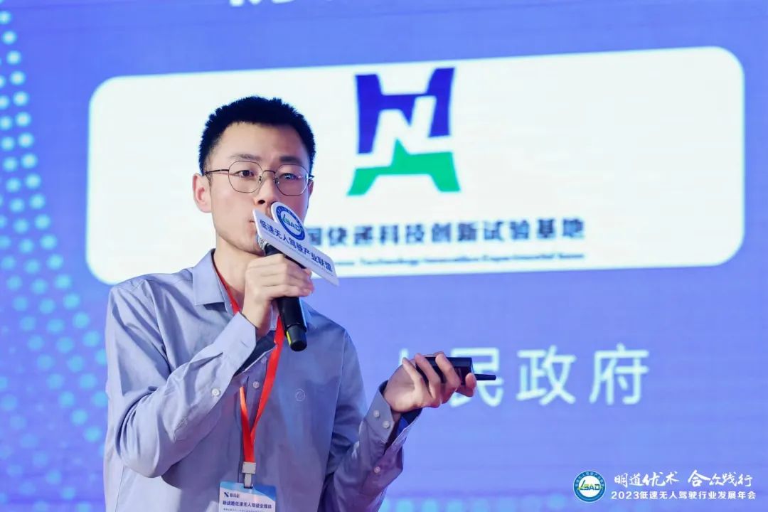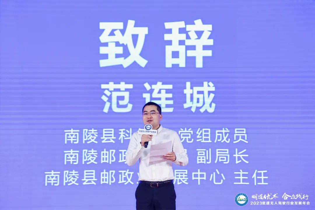 南陵县科技局党组成员、南陵邮政管理局副局长、南陵县邮政业发展中心主任范连城致辞。范连城介绍,近年来,南陵抢抓新能源汽车产业发展机遇,打造快递物流智能装备特色优势产业。在低速无人驾驶领域,南陵无人物流车在全国率先实现商业化运营,目前已有百余台无人配送车在主城区开发道路上行驶,每天派送包裹达3万件,是安徽省规模最大的无人车配送车车队。同时,南陵出台了《打造全城无人化应用示范城市实施方案》及配套扶持政策,打通无人化技术研发、场景示范、商业运营整体链条。