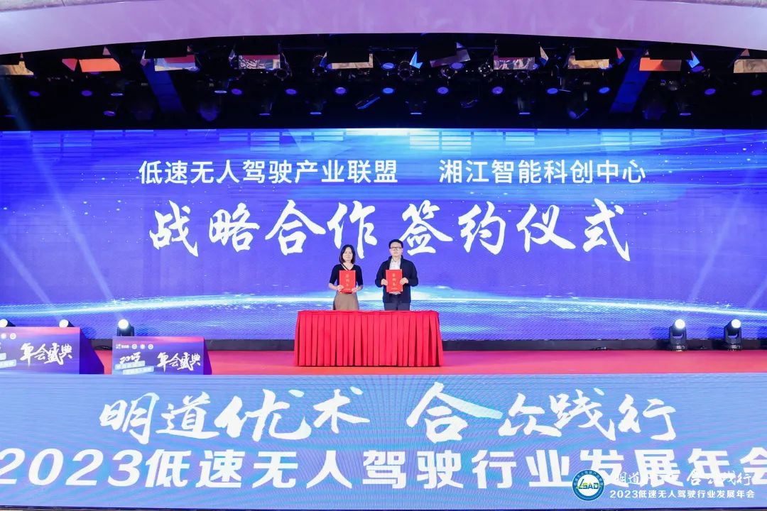 会上,低速无人驾驶产业联盟分别与南通崇川经开区、昆山陆家镇人民政府、芜湖机器人产业发展集团、湖南湘江智能科创中心、青桐资本举行战略合作签约仪式,加速拓展联盟生态圈。