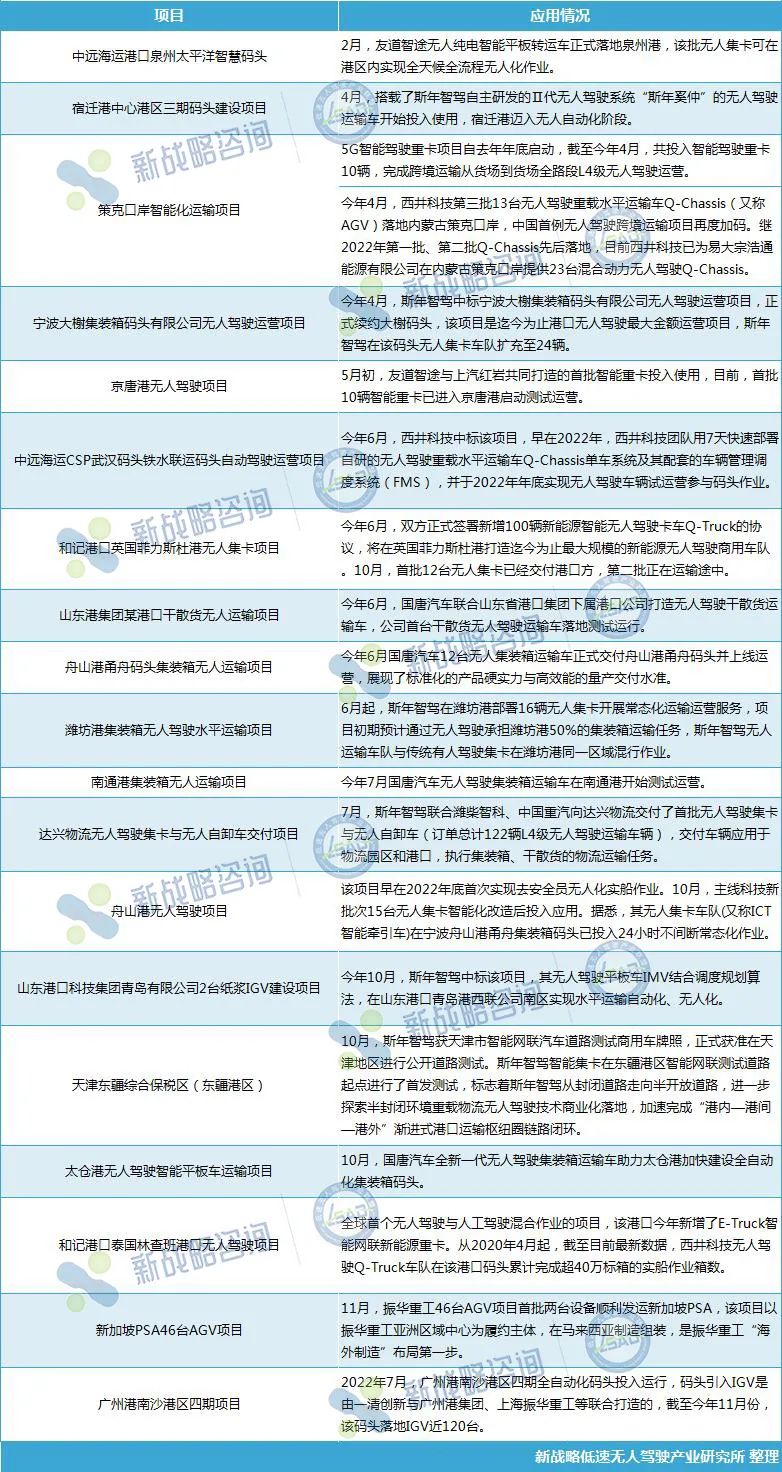 自先导应用试点开展以来,天津港、上海港、厦门远海码头、深圳妈湾港等多个集装箱港口投入数百辆自动驾驶车辆,试点效果取得积极成效。在先导示范效应下,也为了推动港口现代化和提升港口竞争力,国内其他省份纷纷开始大力推进智慧港口建设,今年以来港口无人化建设进程再次取得明显进步。
