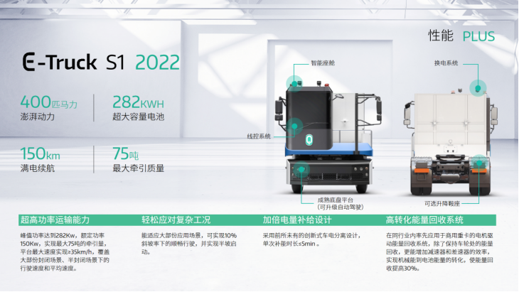 在性能方面,E-Truck配置了282kwh的超大容量电池,可释放400匹澎湃动力,最大牵引力可达75吨,满电续航里程可达150km,平台最大速度实现≥35km/h,覆盖大部份封闭场景、半封闭场景下的行驶速度和平均速度,可实现10%斜坡率下的顺畅行驶,并实现半坡启动。