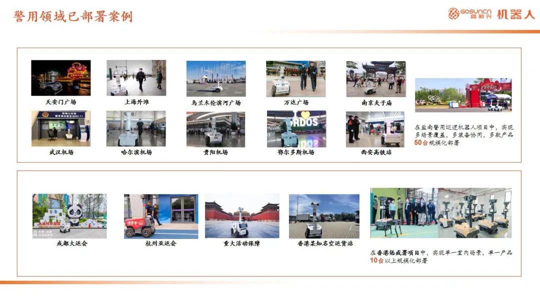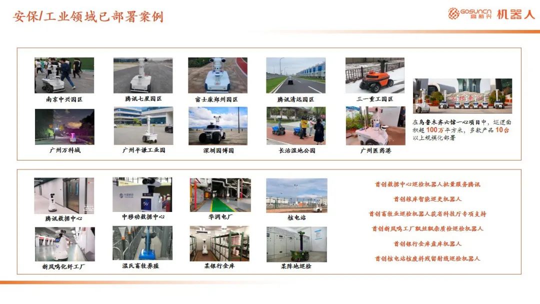产品已广泛应用于警用实战、园区安保、工业巡检等领域,服务了数十个省市自治区及直辖市公安单位,占据整个公安警用巡逻机器人行业60%以上的份额。服务了腾讯、华为、三一重工、中国商飞、万科、中兴、富士康及三大运营商等头部客户,目前占据整个物业安保、园区安保巡逻机器人市场份额35%左右,在工业巡检领域,化纤飘丝飘杂市场占据80%以上市场份额,在能源巡检领域与华为云形成战略合作并在电力巡检,石化巡检及煤炭巡检领域开展技术及市场合作,目前已取得卓越成果,在IDC巡检与腾讯深度合作,并在核电站、发电站及光伏电站领域开展示范。