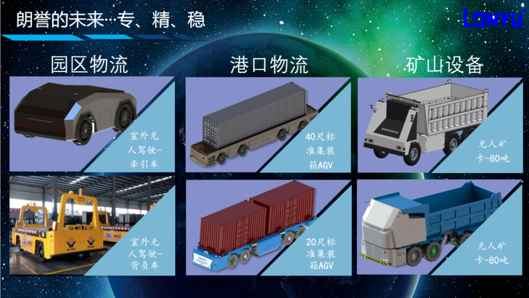 应用场景:各行业的中大型园区物流行业、港口行业、矿山行业等领域产品的室外运输,替代人开燃油车、人开牵引车等传统的生产运输方式。