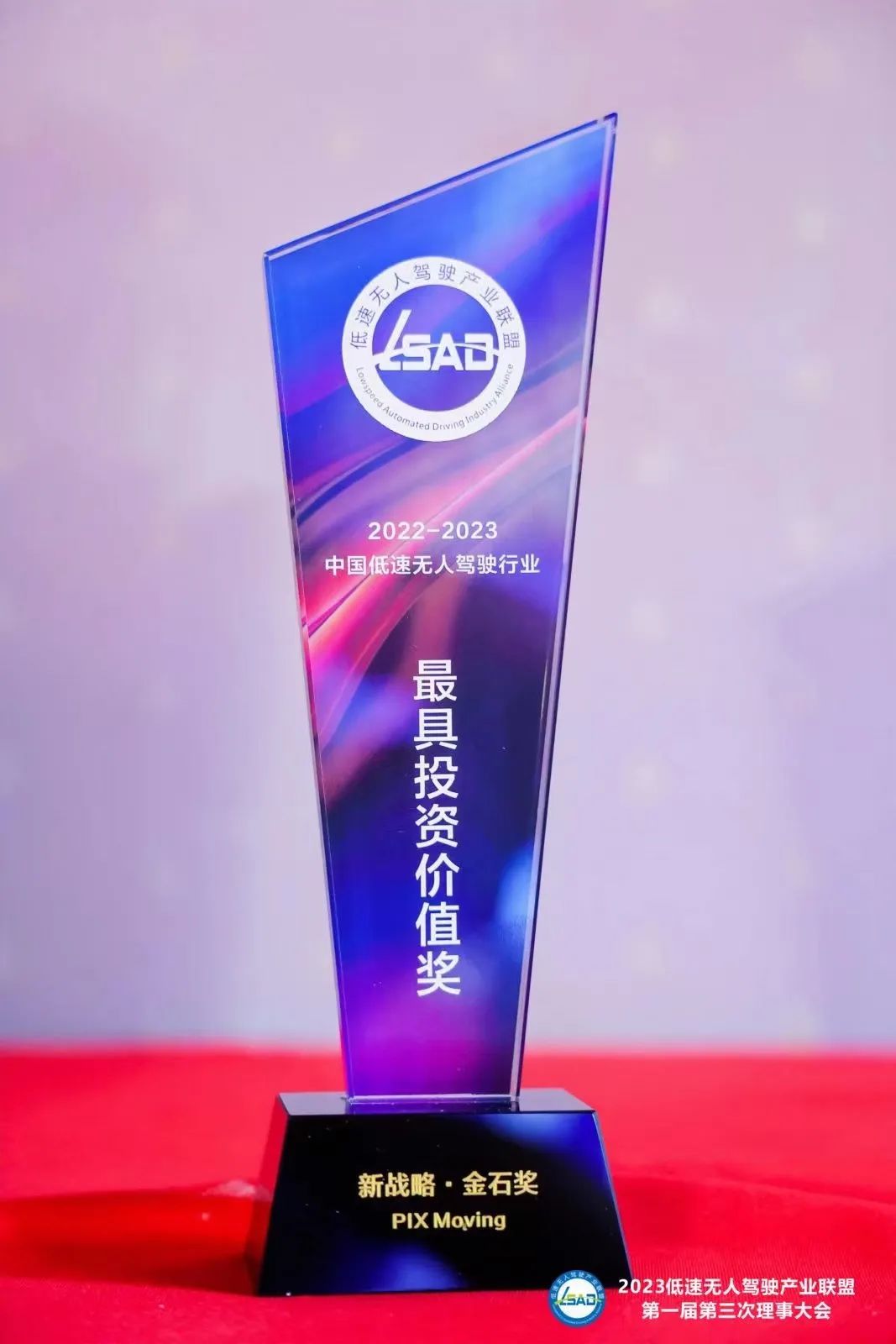 “2022-2023低速无人驾驶行业双年度评选”活动特设创新产品奖、最佳供应链品质奖、最具投资价值奖、最具成长力价值奖。该届评选活动中,PIX Moving 荣获“最具投资价值奖”。