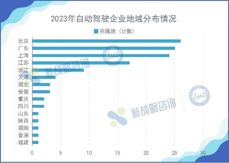从企业地域分布看,2023年仍是北京、上海、广东三大省市的自动驾驶企业吸金能力最强。北京市以26家企业、融资30起继续保持首位,广东省以25家企业、融资30起次之,上海市以24家企业、融资27起位居第三。