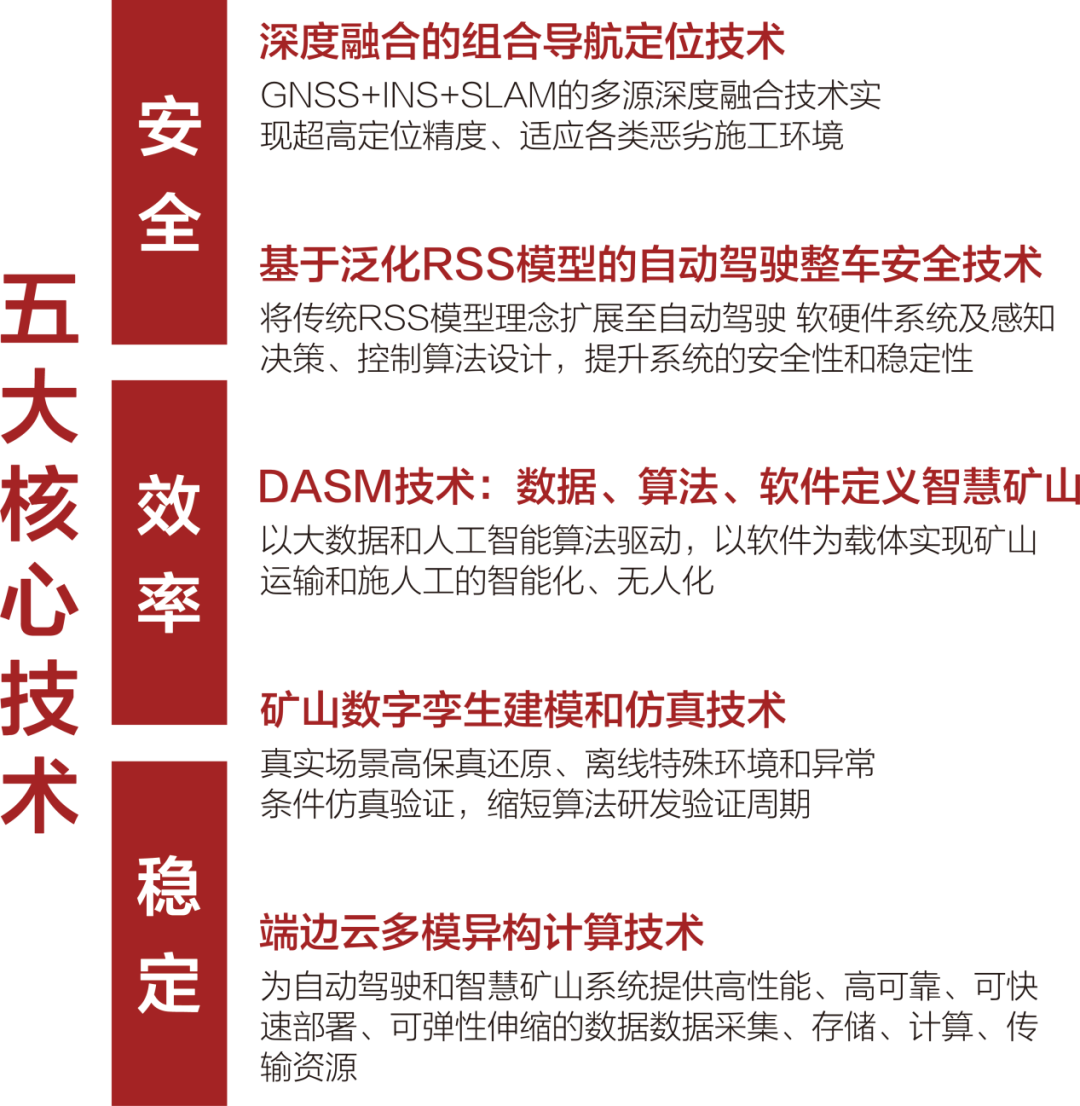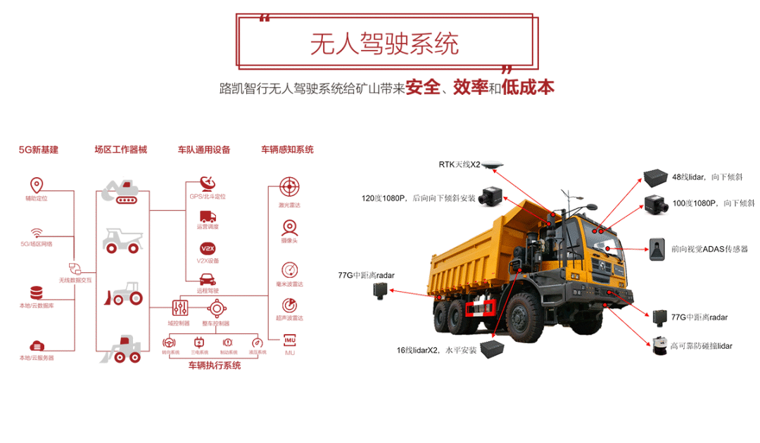在矿区无人驾驶领域,路凯智行基于五大核心技术,打造的无人驾驶系统可实现车铲对位、自主导航、自主卸载、主动避让等功能,实现多岔路口、复杂路况的无人驾驶,帮助各类矿区实现安全、稳定、高效的作业优化。
