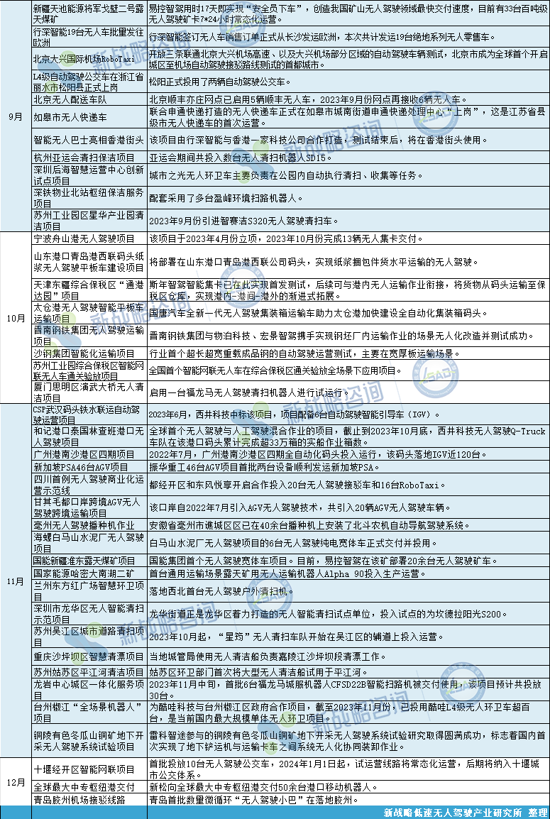 以上新战略低速无人驾驶产业研究所不完全统计了 2023 年国内自动驾驶超 150 个新增落地项目及最新应用情况(无公开报道项目未统计在内),涵盖清洁环卫、矿山、港口、配送、物流、接驳、巡检、载人、农场、公路建设等多个落地场景。(更完整项目信息详见研究所即将发布的《2023-2024年度中国低速无人驾驶产业发展研究报告》)