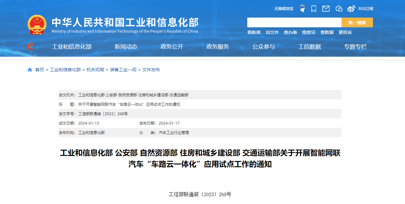 工业和信息化部 公安部 自然资源部 住房和城乡建设部 交通运输部关于开展智能网联汽车“车路云一体化”应用试点工作的通知工信部联通装