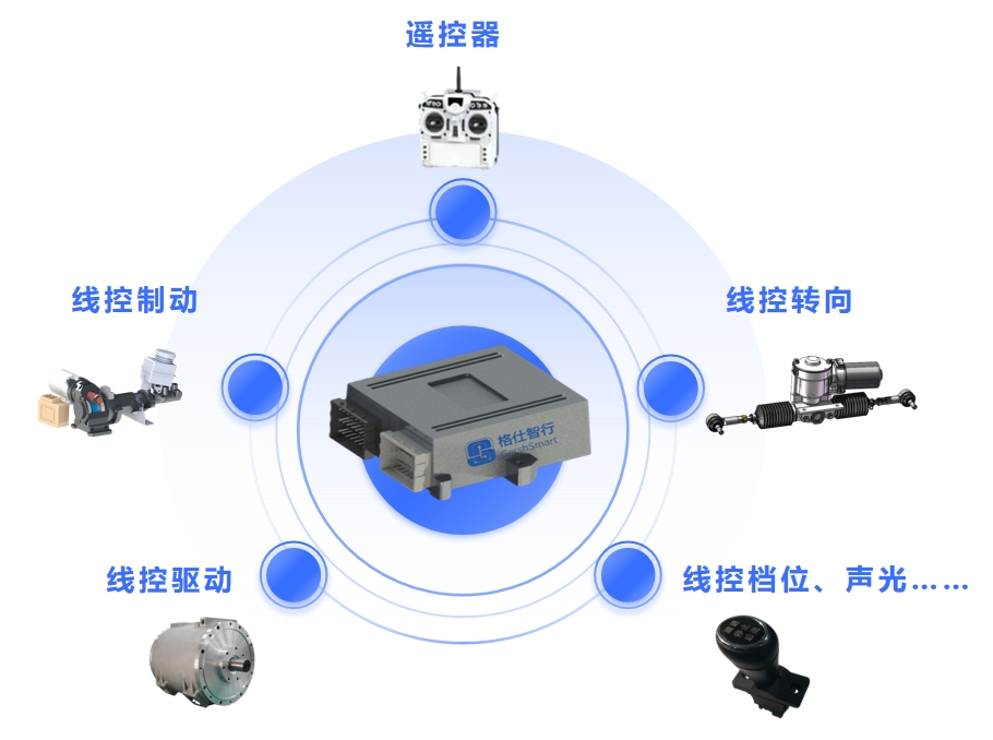 格仕底盘域控制器是面向低速线控底盘而设计的,具备通用化、平台化特性,能够快速适配数百款车型,满足线控底盘快速设计、高稳定落地的要求。格仕底盘域控制器集成控制线控转向、制动、驱动、声光、车窗、作业层等线控部件,内置安全校验系统、开机自检和部件实时监测策略,实现线控底盘的高稳定控制与快速落地。