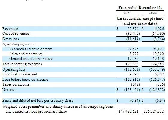 综合来看,2023 年 Innoviz 整体净亏损超 1.23 亿美元,同比 2022 年亏损减少 341.8 万美元;平均每股净亏损 0.84 美元。