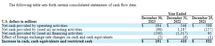 Mobileye 2023 年现金流增长情况(来源:美国证券交易委员会,单位以百万计)