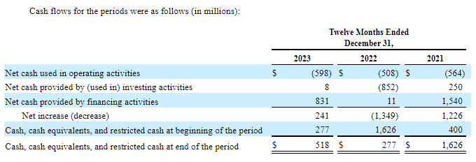 Aurora 2023 年现金流增长情况(来源:美国证券交易委员会,单位以百万计)