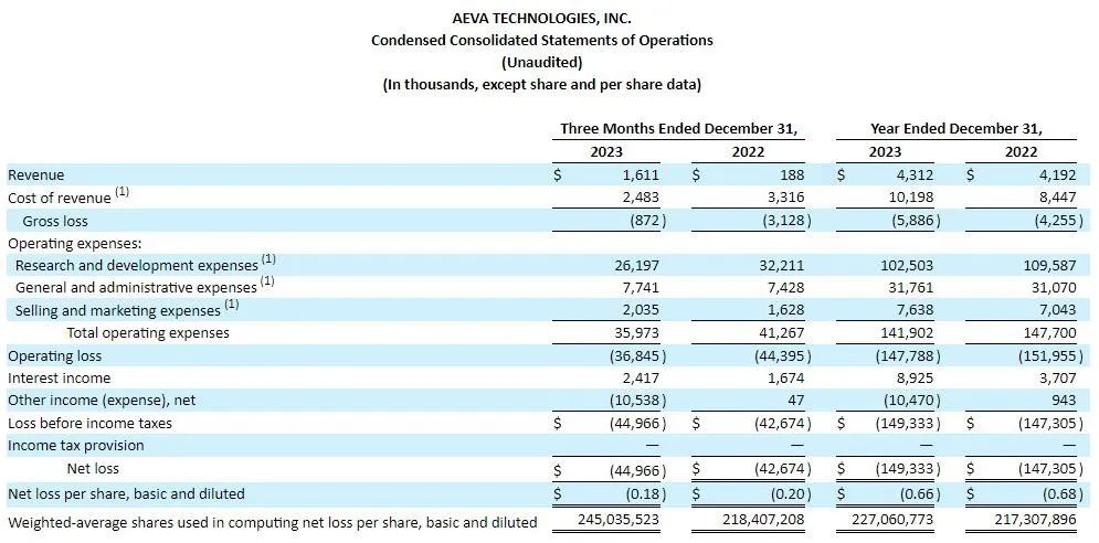Aeva 2023 Q4 及全年未经审计的简明综合运营报表(来源:美国证券交易委员会,单位以千计,份额和每股数据除外)