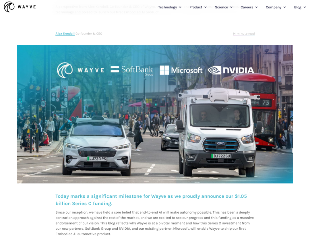 5 月 7 日,英国自动驾驶初创企业 Wayve 宣布,公司获得了 10.5 亿美元的 C 轮融资。本轮融资由软银集团领投,还有英伟达、微软共同参与。