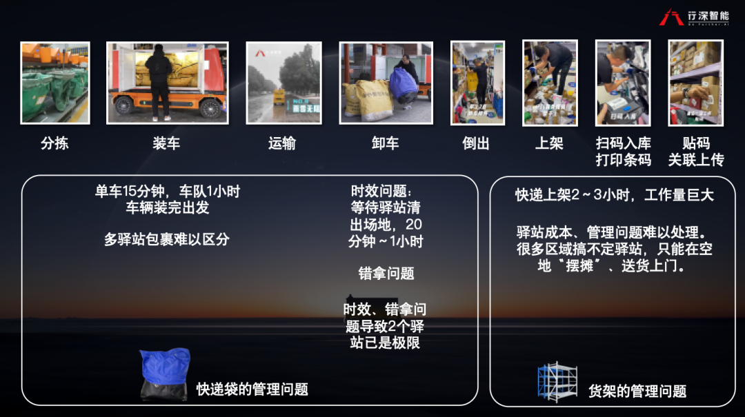 据了解,末端配送作为物流链中的核心环节,其现行流程涵盖了八个关键步骤:分拣、装车、运输、卸车、包裹取出、快件上架、扫码入库并打印条码,以及贴码关联上传。在流程的前半部分,快递袋作为转运的核心载体,在人工装卸过程中暴露出多个效率瓶颈,如多驿站包裹区分,容易错拿以及配送时效长。