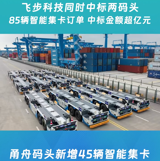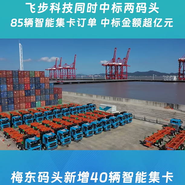 近日,人工智能企业飞步科技宣布,公司已分别中标“宁波梅东集装箱码头有限公司40辆智能集卡采购项目”与“舟山甬舟集装箱码头有限公司45辆智能集卡采购项目”,中标智能集卡总数达85辆,中标金额超亿元人民币。