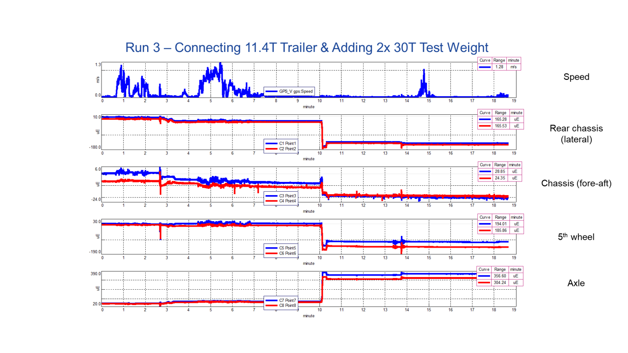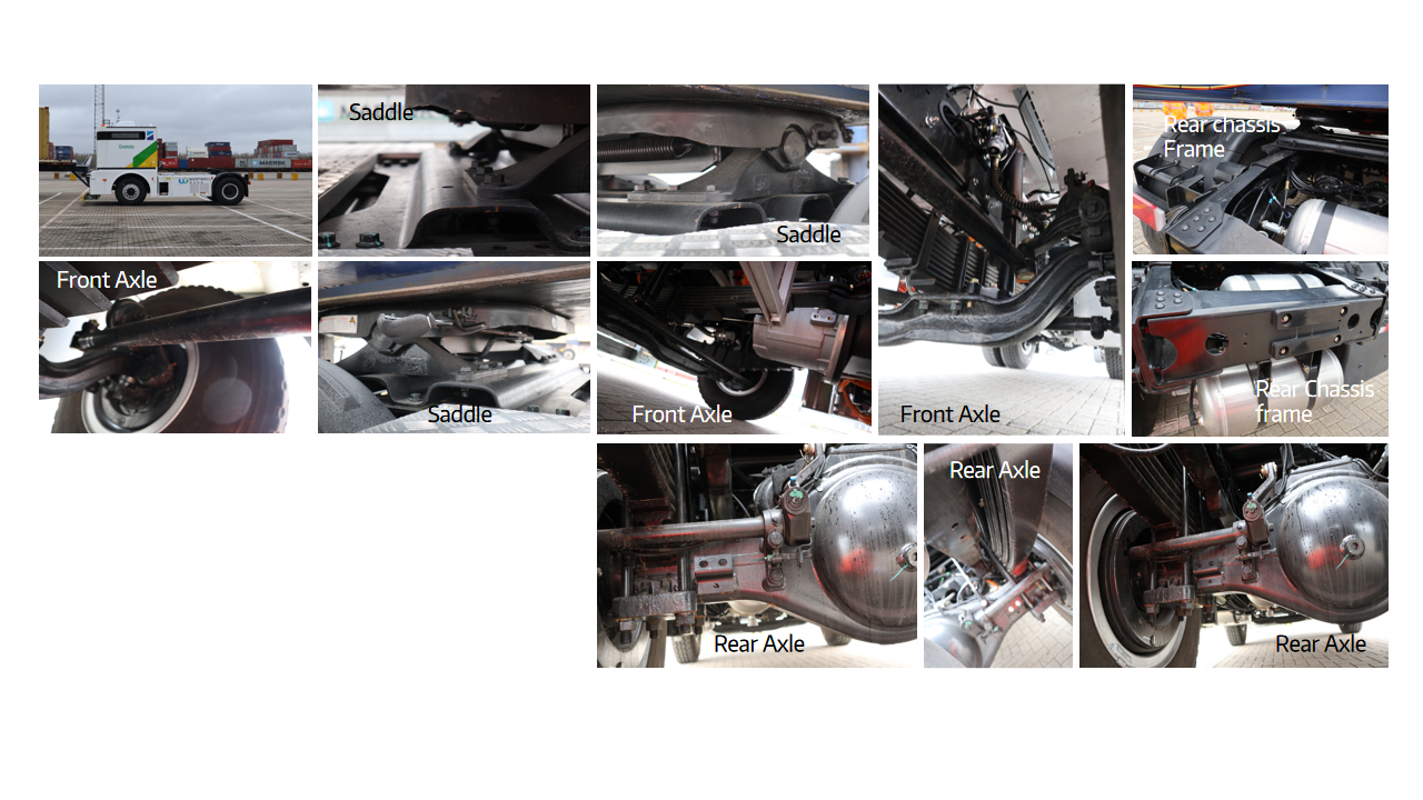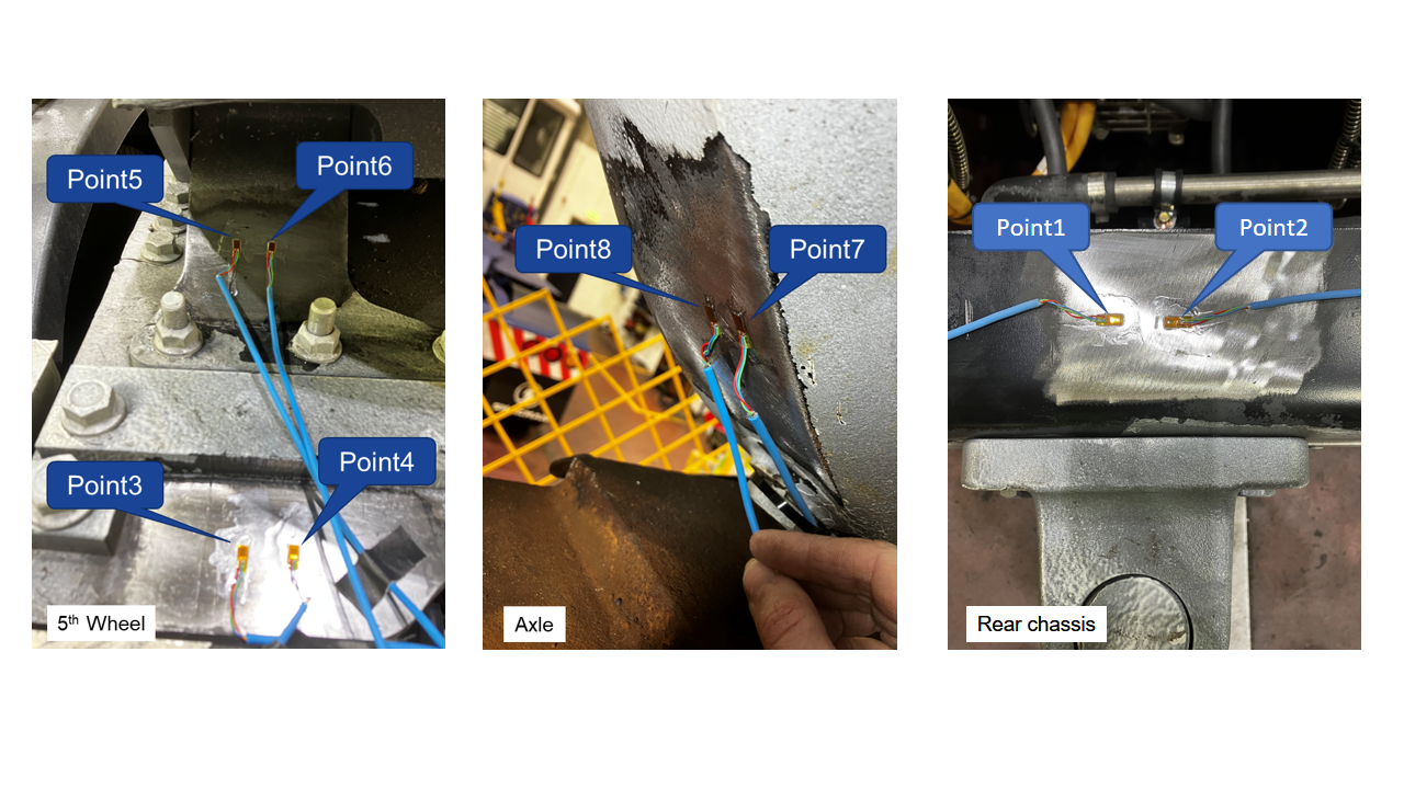 通过港口实际连接及脱离挂车,加速减速,转弯,紧急制动工况的路谱采集,应力应变采集完成实测。