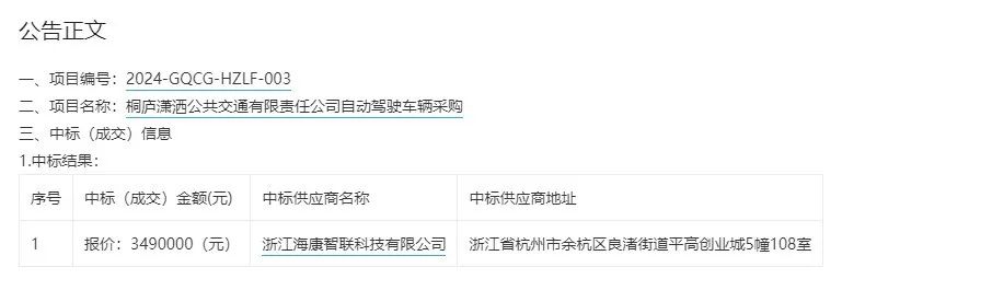 近日,浙江杭州桐庐县“桐庐潇洒公共交通有限责任公司自动驾驶车辆采购”结果公布,浙江海康智联科技有限公司当选供应商;此次招标方为桐庐潇洒公共交通有限责任公司,中标金额3,490,000 元,主要内容为采购2台具备L4级自动驾驶小巴车。