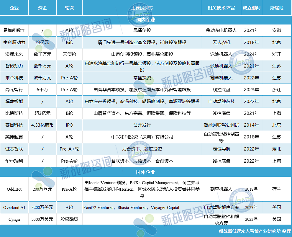 获得融资的整车 / 自动驾驶解决方案企业,多为庭院服务机器人企业。其中,来自泳池机器人赛道的浪涌未来和智橙动力,两笔融资皆源于产业资本,前者追创创投是扫地机器人龙头追觅科技旗下基金,后者基金主要来自科沃斯。