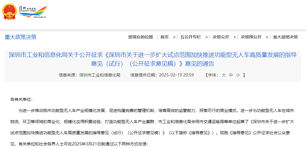 2月19日消息,为进一步推动深圳市功能型无人车产业规模化发展,《深圳市关于进一步扩大试点范围加快推进功能型无人车高质量发展的指导意见(试行)(公开征求意见稿)》公开征求意见。其中提到,统筹推进,试点先行。发挥市级层面统筹协调作用,整体推进功能型无人车运营试点管理工作。