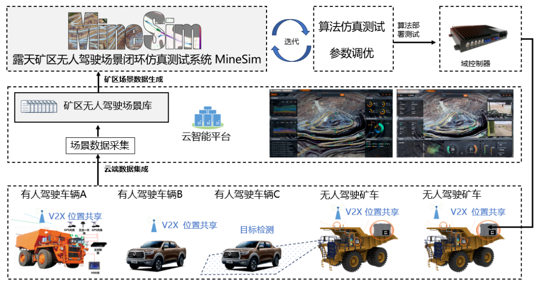 “MineSim”是专为露天矿区无人驾驶运输场景设计的仿真系统。它基于大量真实矿区场景数据,构建了动静态障碍物场景库,涵盖重型矿用卡车执行机构响应滞后、不规则道路边界、异形交叉路口等复杂非结构化特征。