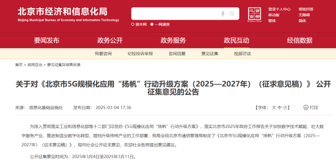 3月4日,《北京市5G规模化应用“扬帆”行动升级方案(2025—2027年)(征求意见稿)》 公开征集意见。其中提到,推动“5G上车”,鼓励汽车前装5G通信模块,助力智能网联汽车智驾、智舱提质升级。