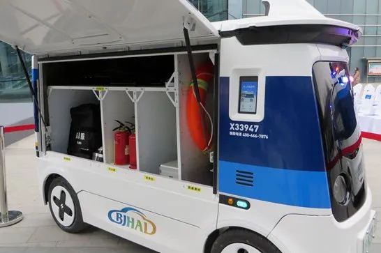 2024年8月,新石器无人车又在北京经开区变作志愿无人车“鹿冰冰”、“鹿暖暖”持牌上岗,车内空间巧妙布局——满载纯净水、清凉湿巾、洁净纸巾以及各类实用宣传手册等物资,将无人车先进科技与志愿服务、职工关怀、社会宣传紧密融合,为市民群众提供更加高效、优质的志愿服务。