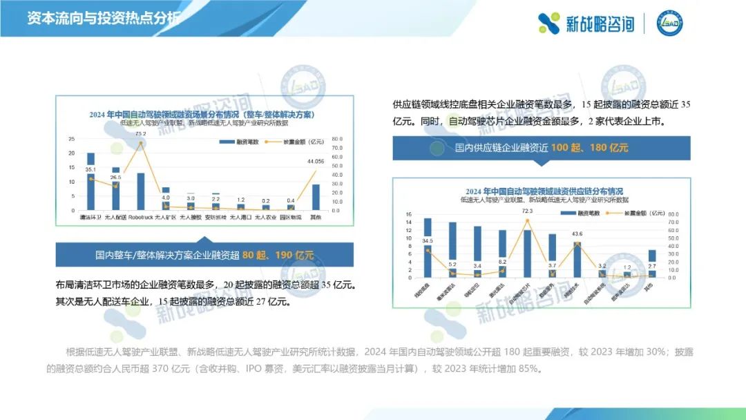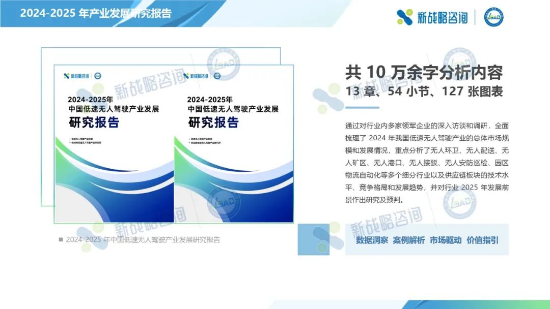 《报告》通过对行业内多家领军企业的深入访谈和调研,全面梳理了2024年我国低速无人驾驶产业的总体市场规模和发展情况,重点分析了无人环卫、无人配送、无人矿区、无人港口、无人接驳、无人安防巡检、园区物流自动化等多个细分行业以及供应链板块的技术水平、竞争格局和发展趋势,并对行业 2025 年发展前景作出研究及预判。(文末附《报告》目录)